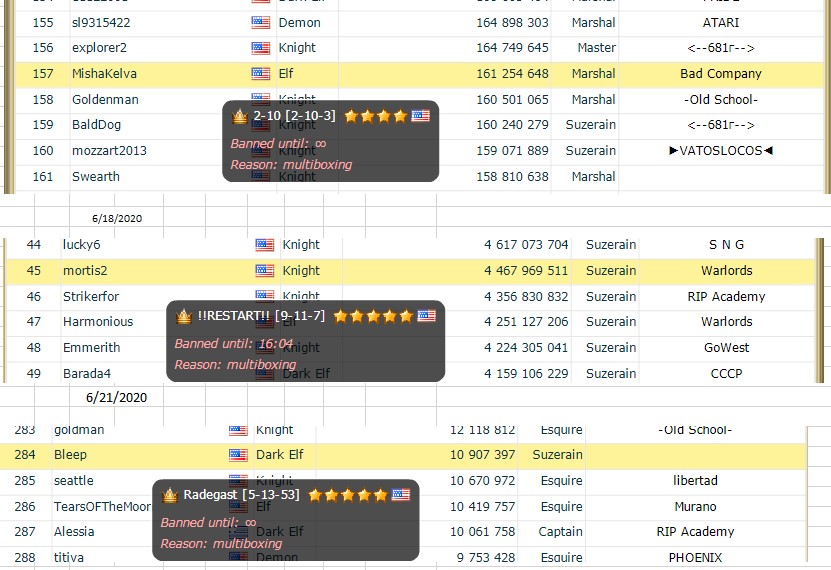 now, where to start. well I guess I'll be generous and give you the one point you did score. mishakelva was in our clan when banned although I have no idea whose multi it is supposed to be because per usual the admin team refuses to ban the main account. this time around there was not even a temporary ban, I checked. as for your other two picks they are a fail. Bleep has been gone from our clan for many many months and it was my understanding that both she and misha would be leaving the game way back then. who was using one, or both, of those accounts I have no idea but it was not either of the two gals who used to have them. the mortis2 account has also been gone from our clan for some time and whoever was using it was not the same person who had it when it was in BadCompany.